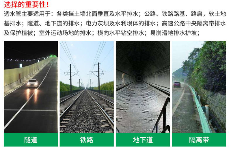 軟式透水管主要適用于:1)各類擋土墻背面垂直及水平排水;2)公路、鐵路路基、路肩,軟土地基排水;3)隧道、地下道的排水;4)電力灰壩及水利壩體的排水;5)高速公路中央隔離帶排水及保護(hù)植被;6)室外運(yùn)動場地的排水;7)橫向水平鉆空排水;8)易崩滑地排水護(hù)坡;9)屋頂花園及花臺排水;10)山坡地水上保持11)整地工程的地下排水;12)低洼地排水及鹽堿地改造系統(tǒng)。
