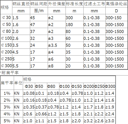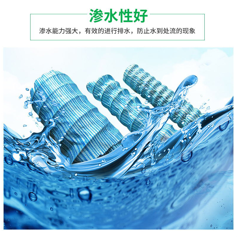 透水管是以防銹彈簧圈支撐管體,形成高抗壓軟式結(jié)構(gòu),無紡布內(nèi)襯過濾,使泥砂雜質(zhì)不能進(jìn)入管內(nèi),從而達(dá)到凈滲水的功能。滌綸絲外繞祉覆層具有優(yōu)良吸水性,能迅速收集土體中多余水份。橡膠筋使管壁被覆層與彈簧鋼圈管體成為有機(jī)一體,具有很好的全方位透水功能,滲透水順利滲入管內(nèi),而泥砂雜質(zhì)被阻擋在管外,從而達(dá)到透水、過濾、排水之目的。
