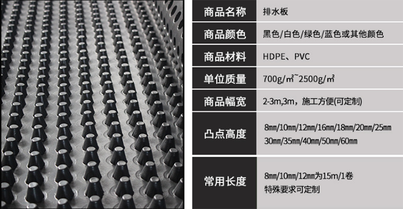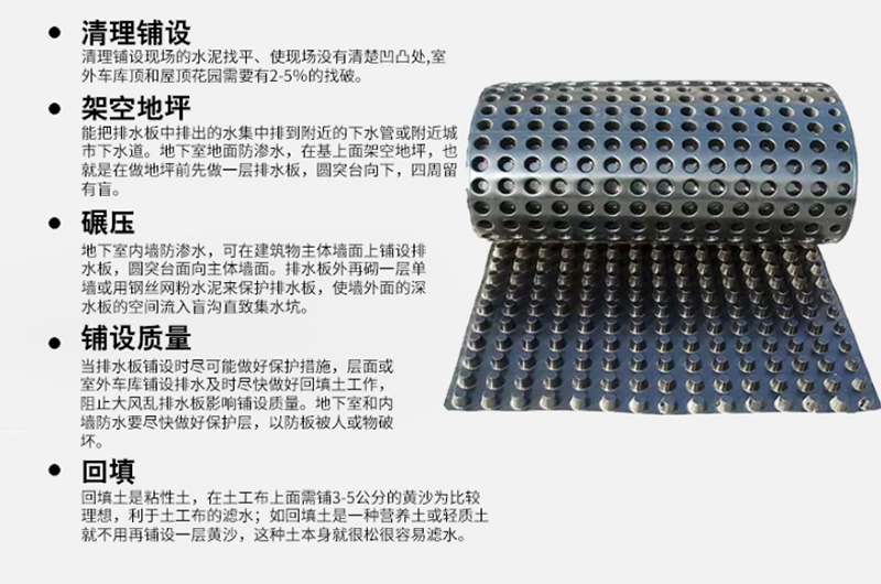 1、導(dǎo)水排水性。2、防水性能。3、排水板保護防護性。4、隔音及通風(fēng)防潮功能。